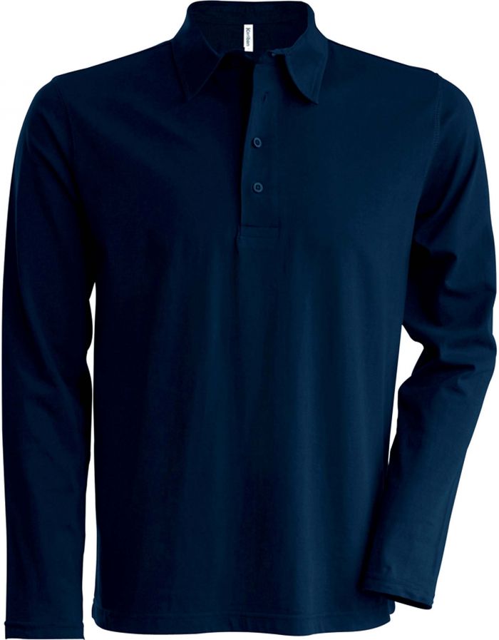 Polo jersey manches longues K205 - Navy composé de 100% coton peigné. Maille jersey. Col avec pied de col (col chemise). Patte de boutonnage 4 boutons. Point de recouvrement aux emmanchures. Finition double aiguille bas de manches et bas de vêtement. L'article Polo jersey manches longues K205 - Navy bénéficie de tarifs dégressifs par quantité et peut être personnalisé en option